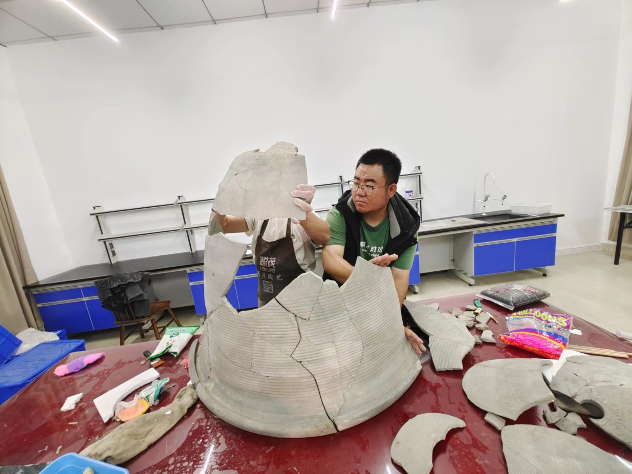 文物保护修复室内 技工与学生在修复战国时期大型陶甑