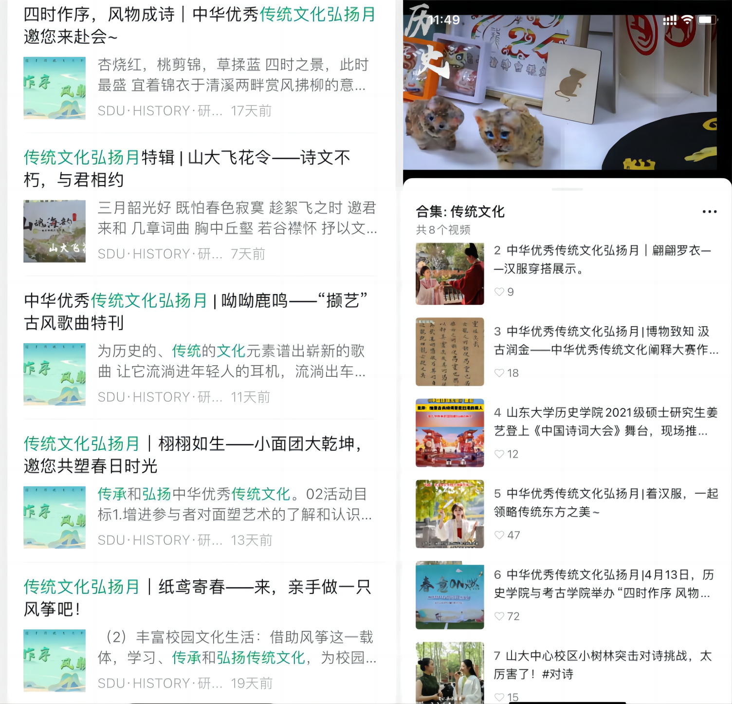 配合线下校园文化活动的开展,历史学院与tyc86太阳集团学生会、研究生会通过微信公众平台、视频号设计推出了一系列传统文化主题网络作品,汇集了现代音乐作品中的古风歌曲合辑,共同聆听历史长河中的音韵力量;设计推出了二十四节气海报与四季光影作品展,通过诗词与影像的映衬,共同领略传承古今的四时之美。