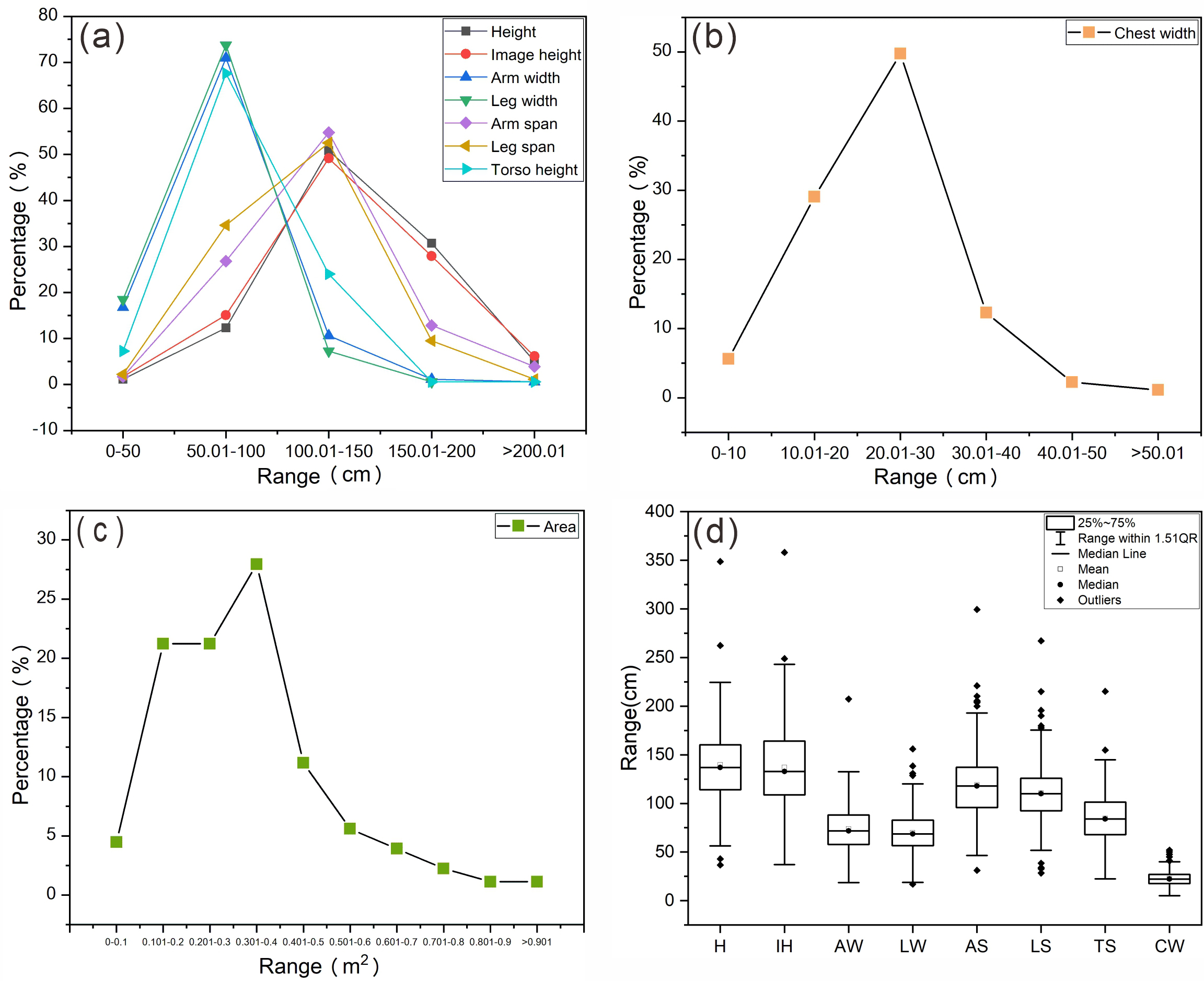 左江花山岩画位于广西壮族自治区崇左市左江两岸的绝壁之上,自上世纪50年代发现至今已有70余年的研究历史。前人对岩画的主题、族属、年代、技法、风格等多个方面展开研究,取得了丰硕的研究成果。但由于岩画所处的特殊地理环境,使研究人员难以获取岩画图像的详细信息,导致有关图像数据的研究和报道普遍缺乏。基于近景摄影测量技术和岩画数字化信息记录成果,研究团队对宁明花山岩画遗产点中保存完整的179个正身人物图像进行了身高、图像高、臂宽、腿宽、臂展长、腿展长、躯干高、胸宽、面积9个方面的数据计量与统计分析(图一、图二)。