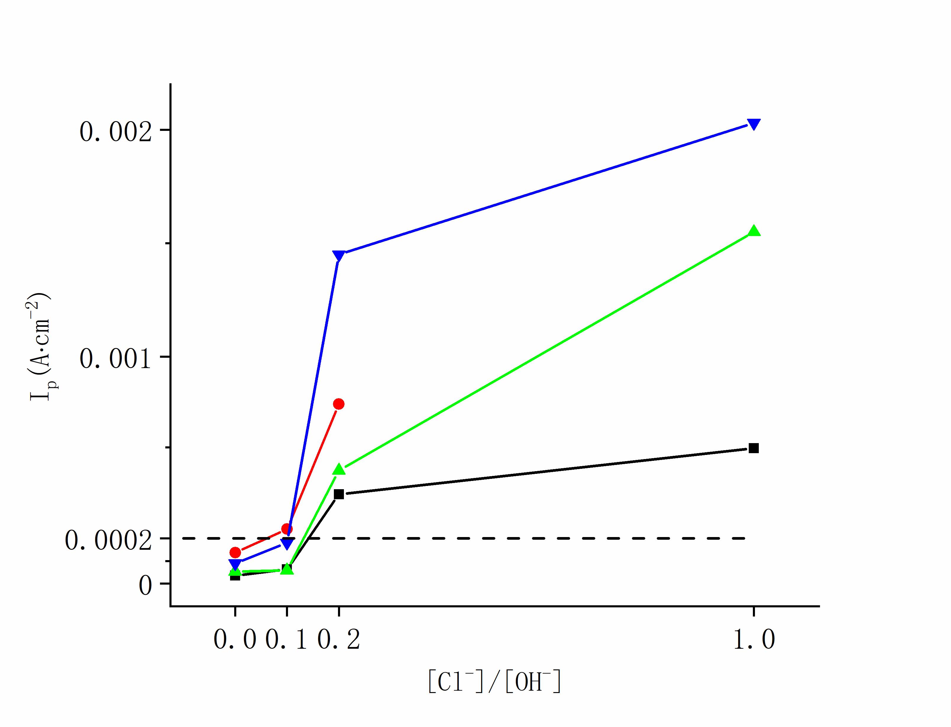 通过检测发现若碱性溶液未及时更换,溶液中过高的氯离子浓度会破坏文物的钝化作用,导致文物的腐蚀速率极大加快(图2)。这一发现表明,看似浸泡在脱盐溶液中被保护处理的文物,实际上可能正在经历快速腐蚀。