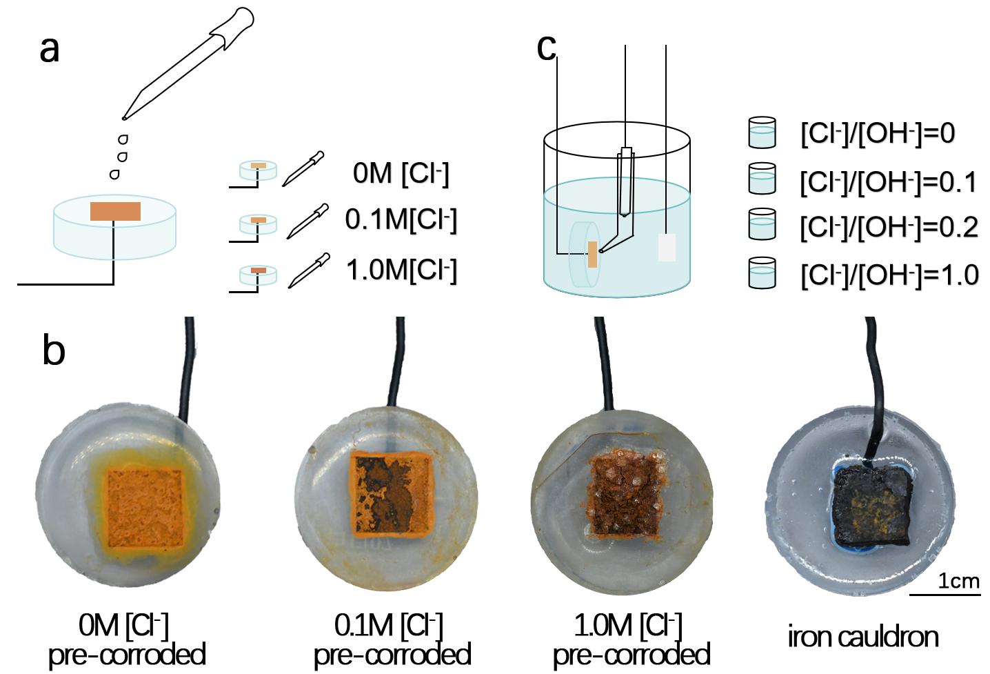 研究团队通过实验设计,制备了含有不同浓度氯离子的锈层样品和碱性溶液,旨在模拟铁质文物在脱盐过程中可能遇到的两种类型的氯离子环境。并将模拟铁片样品以及南海I号出水的铁锅残块制成电化学试样(图1),用于定量检测分析不同氯离子含量下样品的腐蚀速率。