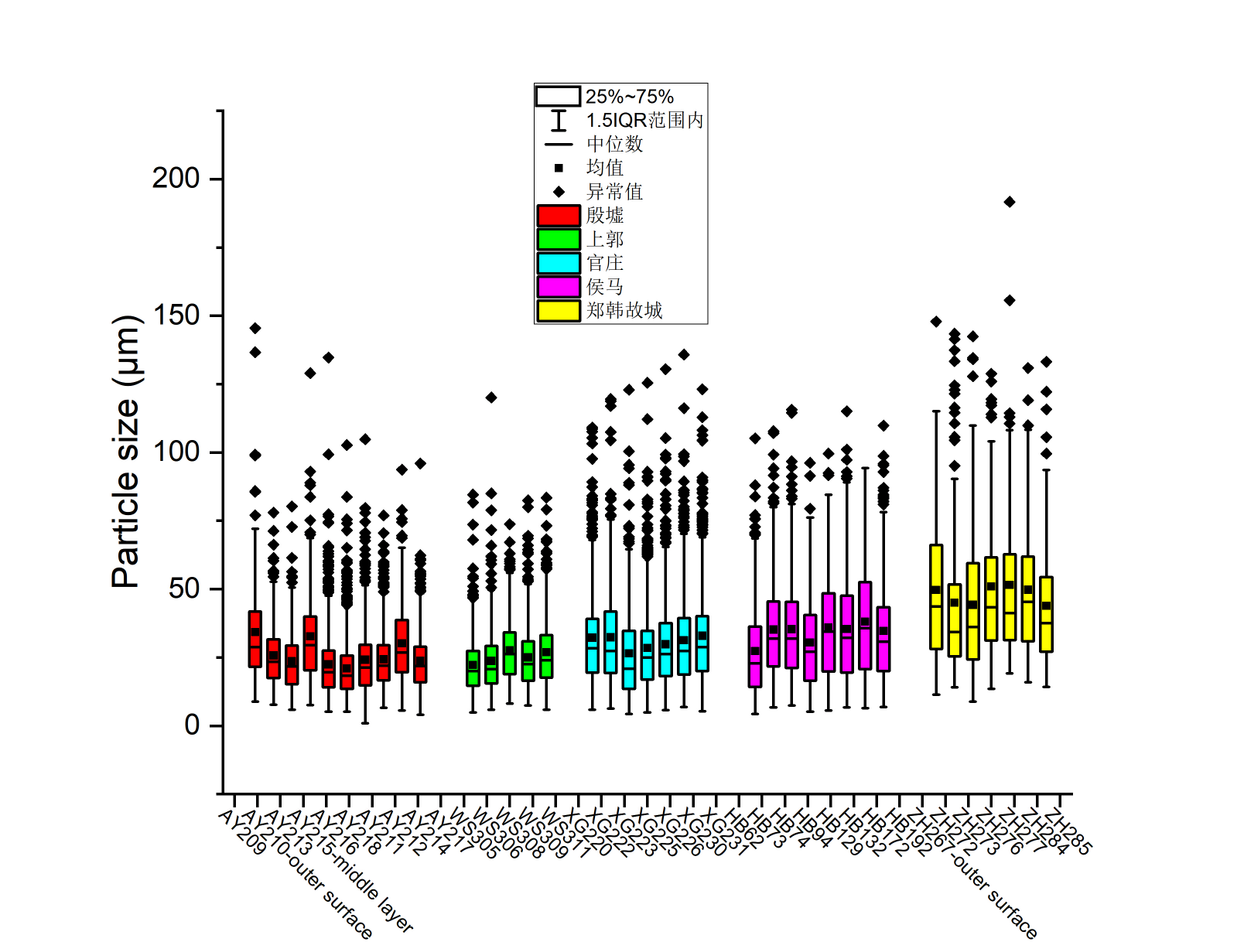 五个遗址的时间顺序为:晚商的殷墟(约公元前 1250 - 1046 年)、春秋早期的上郭(约公元前 745 - 678 年)、西周至春秋中期的官庄(约公元前 1046 - 453 年)、春秋末至战国中期的侯马(约公元前 530 - 380 年)以及东周的郑韩故城(约公元前 770 - 230 年)。粒度分析箱式图(图4)显示,从早到晚,五遗址陶范材料的粒径及其范围均是逐渐增大的。此变化趋势或许代表了各遗址原料和材料加工的地区差异,也或许代表了陶范材料加工的时代变迁。