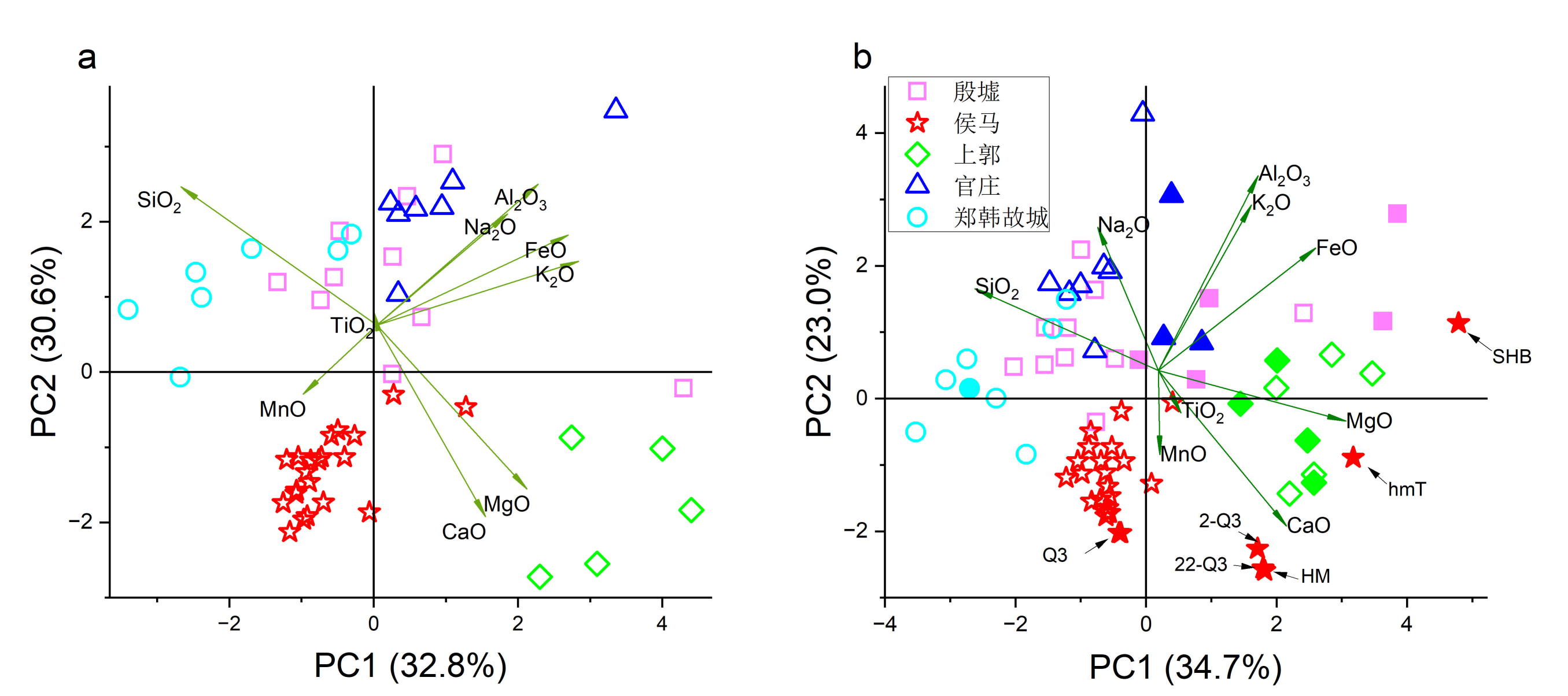 图 3 各遗址考古样品(空心标志)与生土样品(实心标志)地球化学成分的PCA图