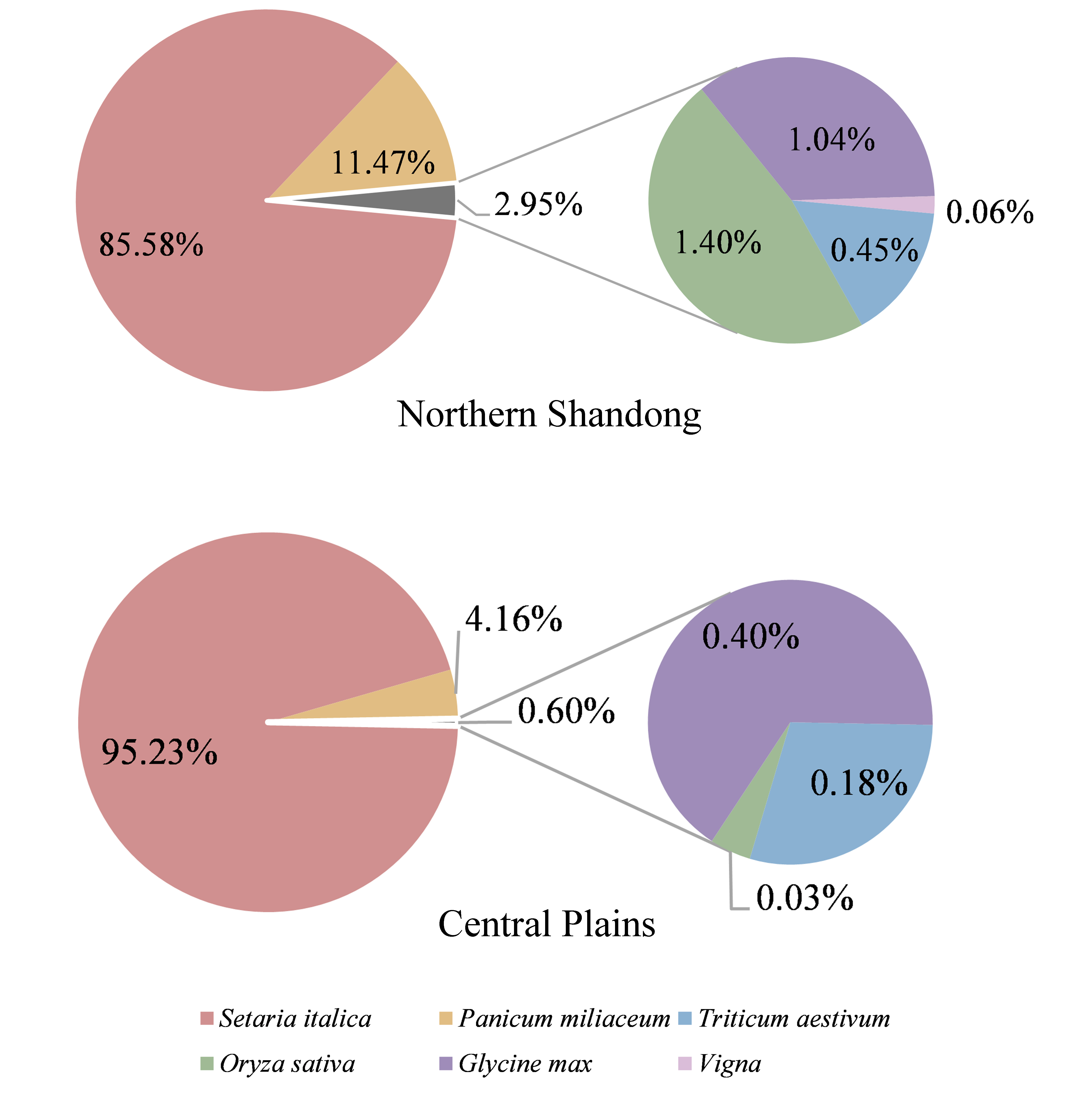 通过汇总鲁北地区岳石文化和其他晚商文化遗址的炭化植物遗存数据,并将其与中原地区晚商文化遗址的炭化植物遗存数据进行对比,发现鲁北地区岳石文化时期的农业是以粟、黍为核心的旱作体系为主导,辅以少量水稻、大豆及小麦;水稻仅见于少数遗址,分布有限。至晚商时期,鲁北延续并强化了旱作传统,粟的主导地位进一步凸显,水稻的分布范围有所扩大,在农作物结构中的相对占比有小幅提升。中原晚商农业则呈现更为单一的旱作特征,粟、黍占比远超鲁北,几乎垄断农作物组合,其中粟占绝对优势地位,黍的占比较小,水稻仅零星发现于极个别高等级遗址。两区域农作物结构的差异突出反映在水稻的局部存续和利用上(图三、图四)。