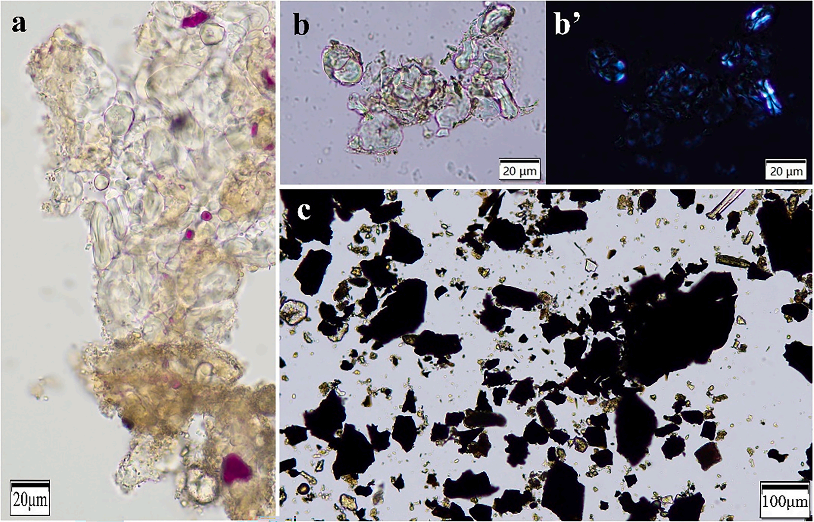 图四 M28 牙结石中的糊化淀粉(a)、M42:4 鼎中的糊化淀粉(b、b')和 M42:4 鼎中的微炭屑(c)。