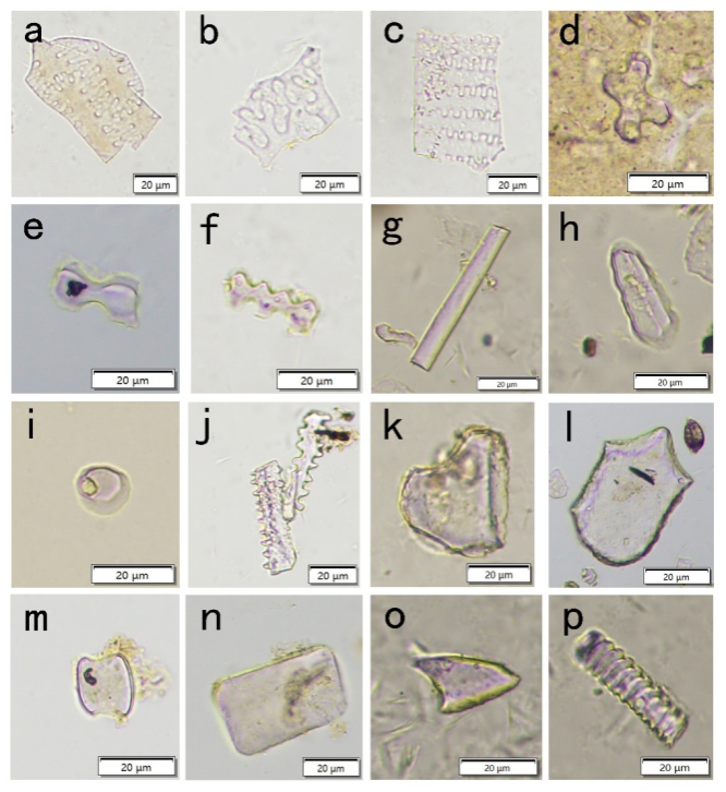 a.黍η型;b.粟Ω型;c.黍亚科n型;d.十字型;e.哑铃型;f.多铃型;g.平滑棒型;h.齿型;i.圆台型;j.刺棒型;k.扇型;l.芦苇扇型;m.鞍型;n.长方型;o.尖型;p.导管