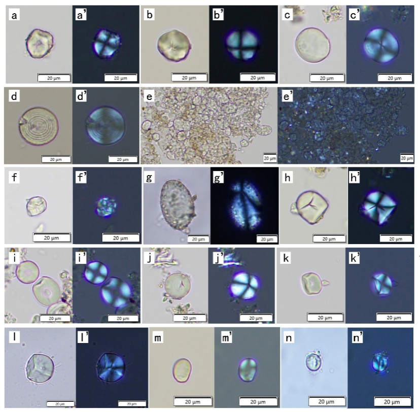 研究团队运用淀粉粒、植硅体和微炭屑等多重微体指标分析方法,对来自10具人类骨骼的牙结石样本和30件陶器样本进行分析(图一)。研究人员共鉴定出612粒淀粉粒,主要来源于粟(Setaria italica)和黍(Panicum miliaceum),这是当时的主要粮食作物。此外,还发现了薏苡(Coix lacryma-jobi)、小麦族(Triticeae)、稻(Oryza sativa)、栎属(Quercus)、块根块茎等植物的淀粉粒(图二),表明了焦家先民植物类食物来源的多样性。值得注意的是,此研究首次在山东北部地区发现了大汶口文化时期稻的消费证据。牙结石的植硅体分析进一步识别出了黍稃壳的η型植硅体和粟稃壳的Ω型植硅体,以及其他各类形态的植硅体(图三)。与此同时,此研究将所得植物微体遗存证据和已有的炭化植物遗存证据及人骨同位素证据进行结合探讨,在此基础上尝试复原了个体饮食活动历史(如M72男女个体),展示出不同的生业考古证据如何相互补充,进而更为全面地探讨古代先民的饮食结构与生计活动。