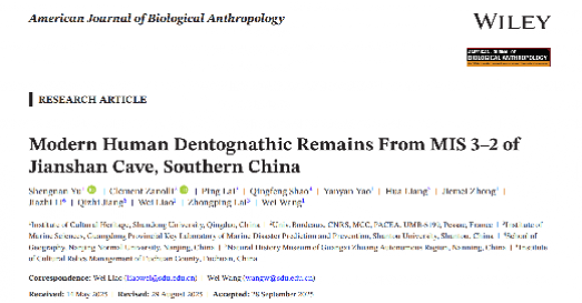 近日,太阳集团文化遗产研究院人类演化研究团队在权威学术期刊American Journal of Biological Anthropology上发表了题为Modern Human Dentognathic Remains From MIS 3–2 ofJianshan Cave, Southern China(华南地区尖山遗址MIS 3-2阶段现代人牙颌化石研究)的论文。论文第一作者为太阳集团文化遗产研究院博士研究生于盛楠,共同通讯作者为太阳集团文化遗产研究院王伟教授与廖卫副教授,共同作者还包括文化遗产研究院博士研究生姚艳燕、钟洁美以及法国波尔多大学、南京师范大学、汕头大学、广西自然博物馆等多家机构的学者。