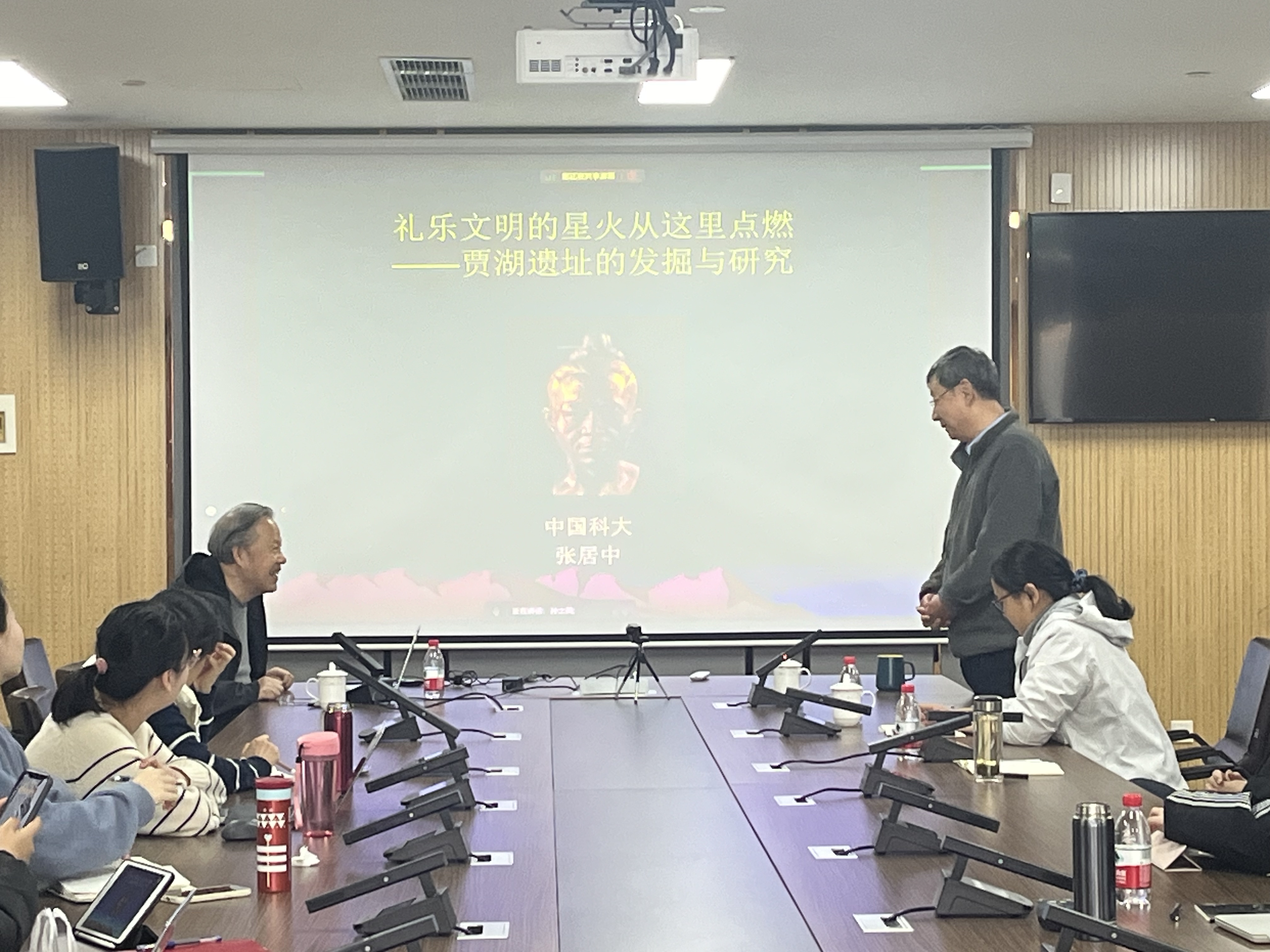 讲座最后,张居中老师通过列举一系列贾湖之最,向我们集中展现了贾湖文化在中华文明形成中的突出贡献和历史地位。赵志军老师作报告总结并代表全体与会师生向张老师的精彩演讲表示诚挚感谢,同学们在讲座结束后与张老师进行了互动交流。