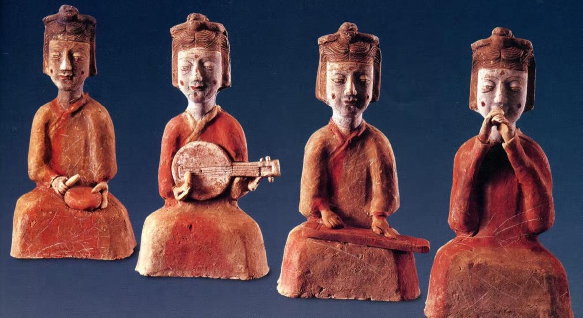 谢老师着重强调了以下几处具有重要意义的发现:文林小区M49中出土随葬铭文砖尤为引人注目,铭文砖刻“建元十四年二月十二日张氏女朱圯妇”,明确标明墓葬年代为前秦建元十四年(378年),为判定咸阳地区十六国墓葬年代提供了极为重要的参考标尺。同时,由于平陵M1位于塬之间的缓坡地带,没有淤泥侵入,使其成为十六国墓地中保存最为完好的墓葬,特别是彩绘颜色保存非常完好,出土了一批非常精美的文物,有釉陶铠甲马、彩绘铠甲马、骑马乐俑、坐乐俑、彩绘牛车和彩绘轺车等。其中平陵M1中出土的四件女坐乐俑极具特色,位于墓室西侧,形状大小基本相同,通体饰彩;头戴黑色十字形扁平发冠,额发分两层由中间梳向两边,上身穿红褐色窄袖交领衣,下身着红、褐色宽摆裙;均跽坐,弹奏乐器,乐器分别为筝、鼓和琵琶,惜呈吹奏状的乐俑执物丢失。平陵M1西侧的陶俑群体现了游牧民族在转向定居的过程中,在不断吸收、融合汉族的政治和文化特色。此外,咸阳布里M63是目前已知规模最大的十六国时期的墓葬,墓葬内保存有完整的大场景演奏场面,经研究发现有乐俑持琴、筝、筑、阮咸、竽、箫、排箫和鼓在表演,是华胡音乐文化交融的重要见证。