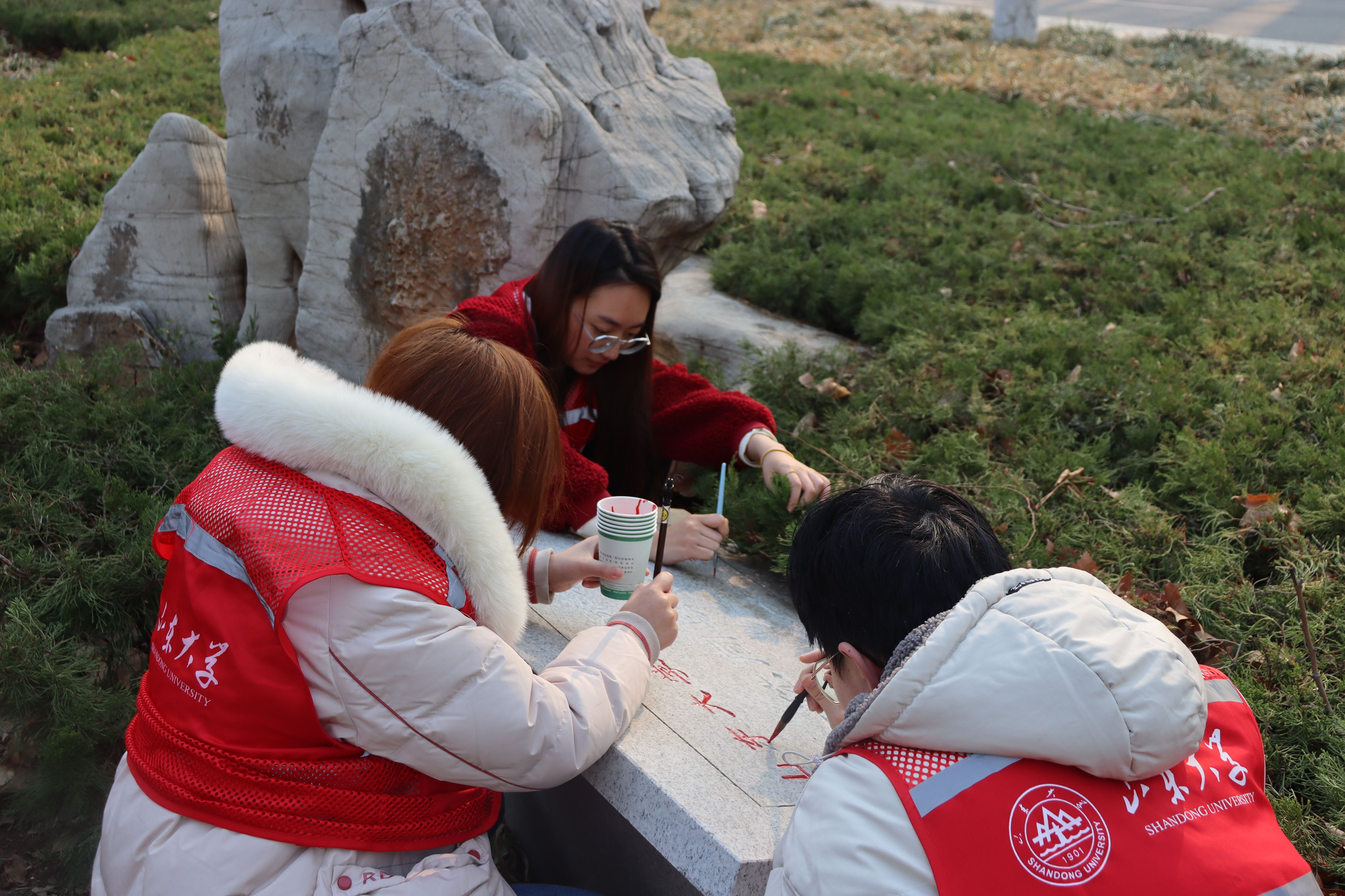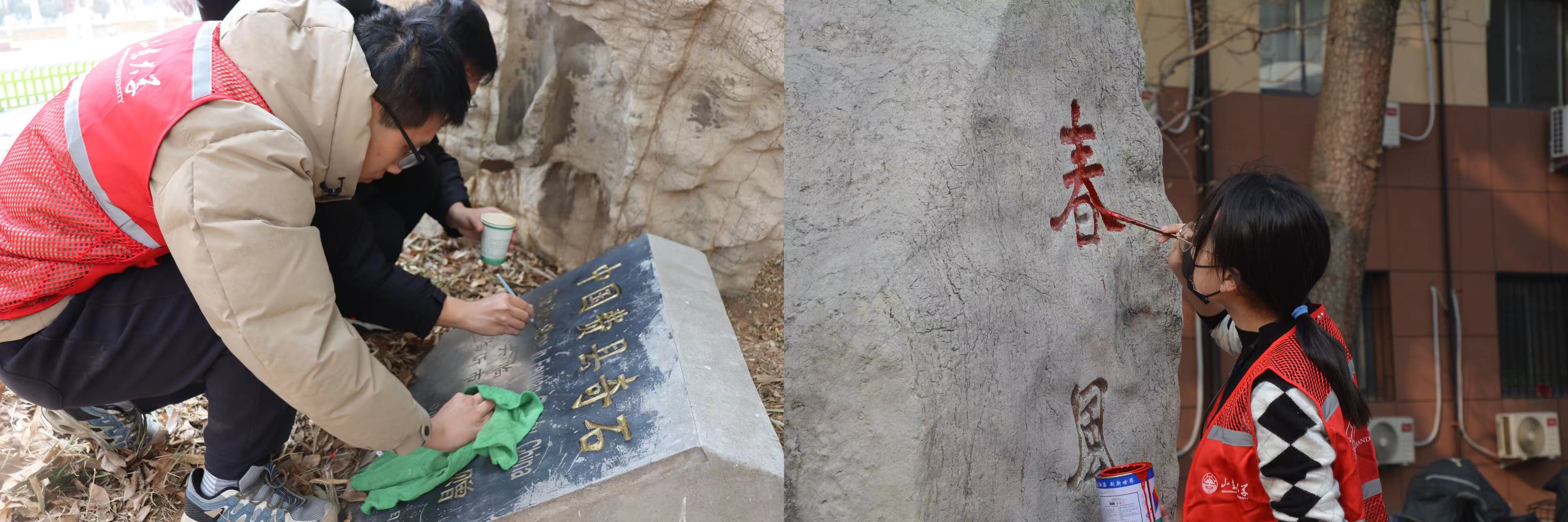此外,学生先后对图书馆、邵逸夫科技馆、公教楼、文史楼、国际教育学院等地附近的景观雕塑进行了清洁,对石碑雕刻文字进行补色。同学们用实际行动诠释了对雷锋精神的理解,进一步感悟山大人文情怀,让山大历史文脉在新时代山大青年中更好传承下去。经过志愿者们的共同努力,校园里景观碑刻的文字愈发闪亮。