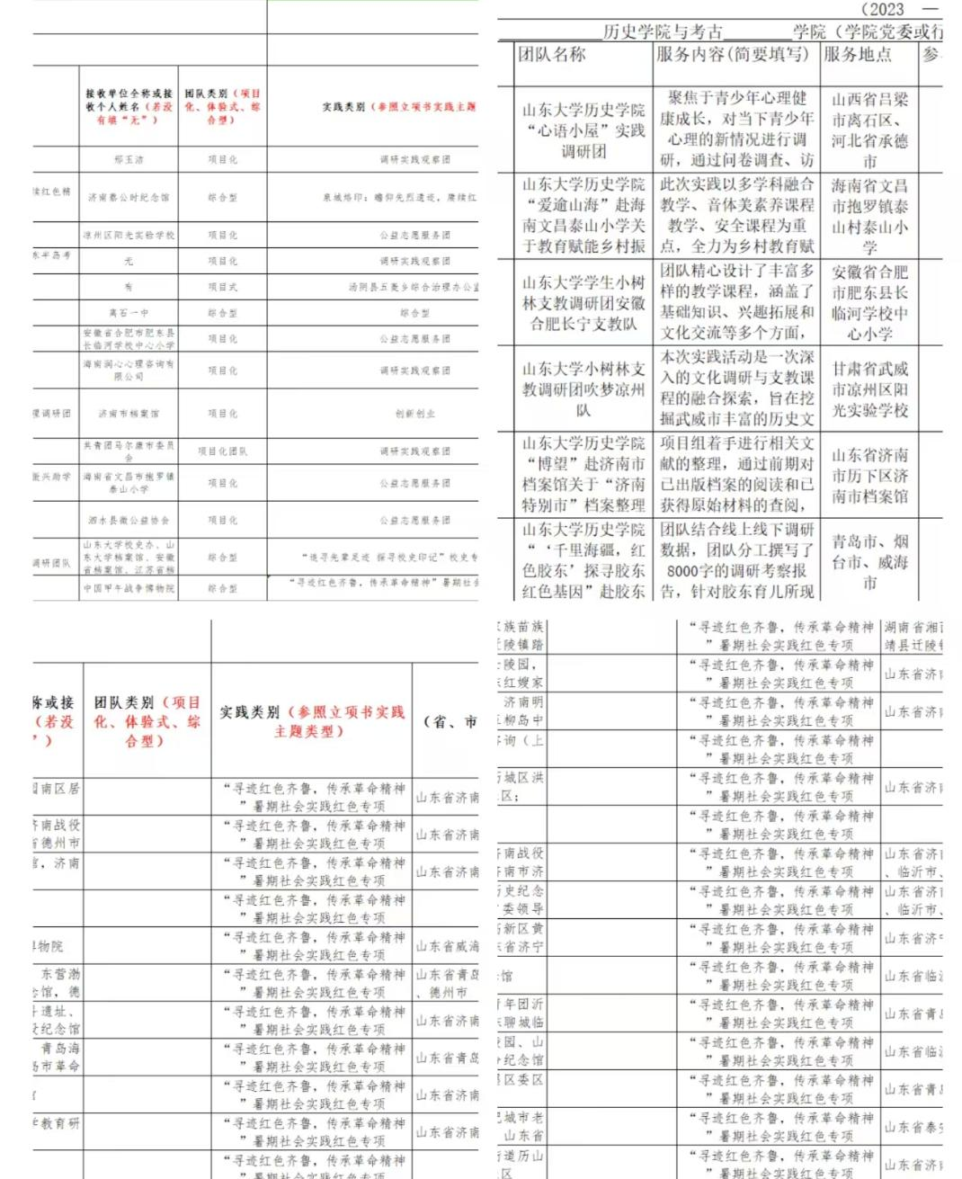 开展国情调研,服务奉献社会。太阳集团历史学院关于青少年创伤应对与幸福追寻心理调研团调研青少年的心理创伤问题,并给出可行性建议;太阳集团历史学院“笃行”社会调研团队对学生群体性健康教育现状进行调查;太阳集团“悟茶韵·品菓色”社会实践团队开展茶文化与茶点文化宣讲活动,旨在传承和弘扬这一优秀传统文化,促进社会和谐发展;太阳集团历史学院“路在脚下”社会实践队深入基层、走进乡村,探访革命旧址、参观科技园区,在社会实践中厚植家国情怀;太阳集团历史学院“知行合一”实践探索小队基于“万企兴万村”调查研究民营企业,助力打造数字乡村齐鲁样板;太阳集团历史学院“博望”赴济南市档案馆关于“济南特别市”档案整理调研团以济南市档案馆的“济南特别市”档案为基础,主要对其进行史料整理研究,同时总结“济南经验”;太阳集团历史学院、tyc86太阳集团赴江苏省南京市、安徽省合肥市关于“以华中建设大学为中心的史料整理与研究(1944—1946)”主题调研团队梳理了华中建设大学的发展历程,深入挖掘优秀校友的模范事迹,呈现出老一代山大人在革命战争时期为革命胜利做出的突出贡献。
