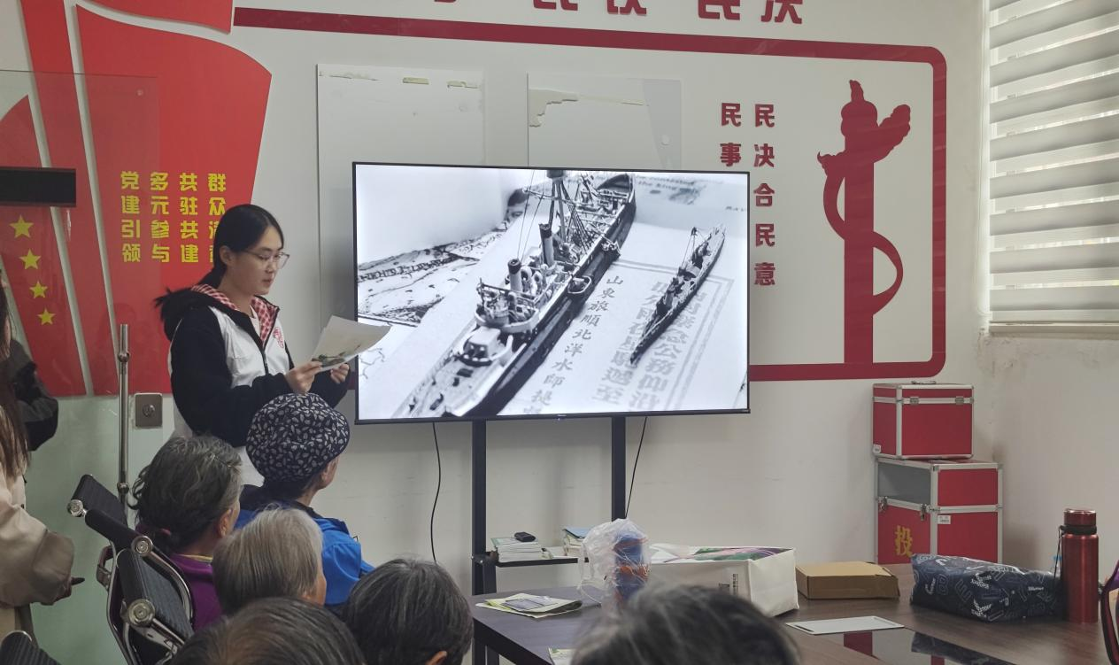 在文物背景宣讲环节,同学通过精心制作的PPT,结合图片、文字资料与讲解的紧密配合,生动再现了甲午战争时期的场景,使居民们能够更加直观地感受那段波澜壮阔的历史。