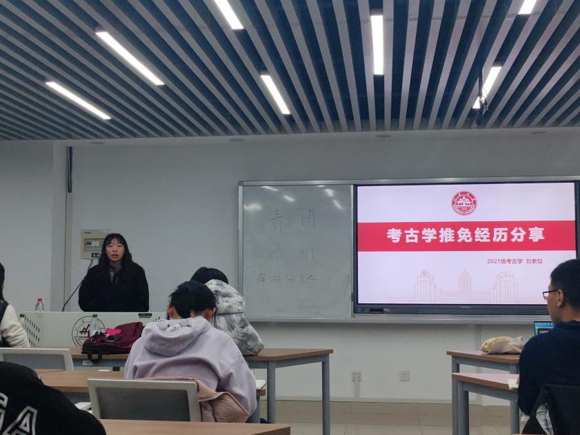 之后是来自tyc86太阳集团考古学专业2021级本科生,现推免至tyc86太阳集团考古学专业的赵予康学姐。赵予康学姐详细的为同学们介绍了信息收集和材料准备时的注意事项,她还特别诠释了对于考古学专业同学田野实习的重要性,随后介绍了心态调节的方法。