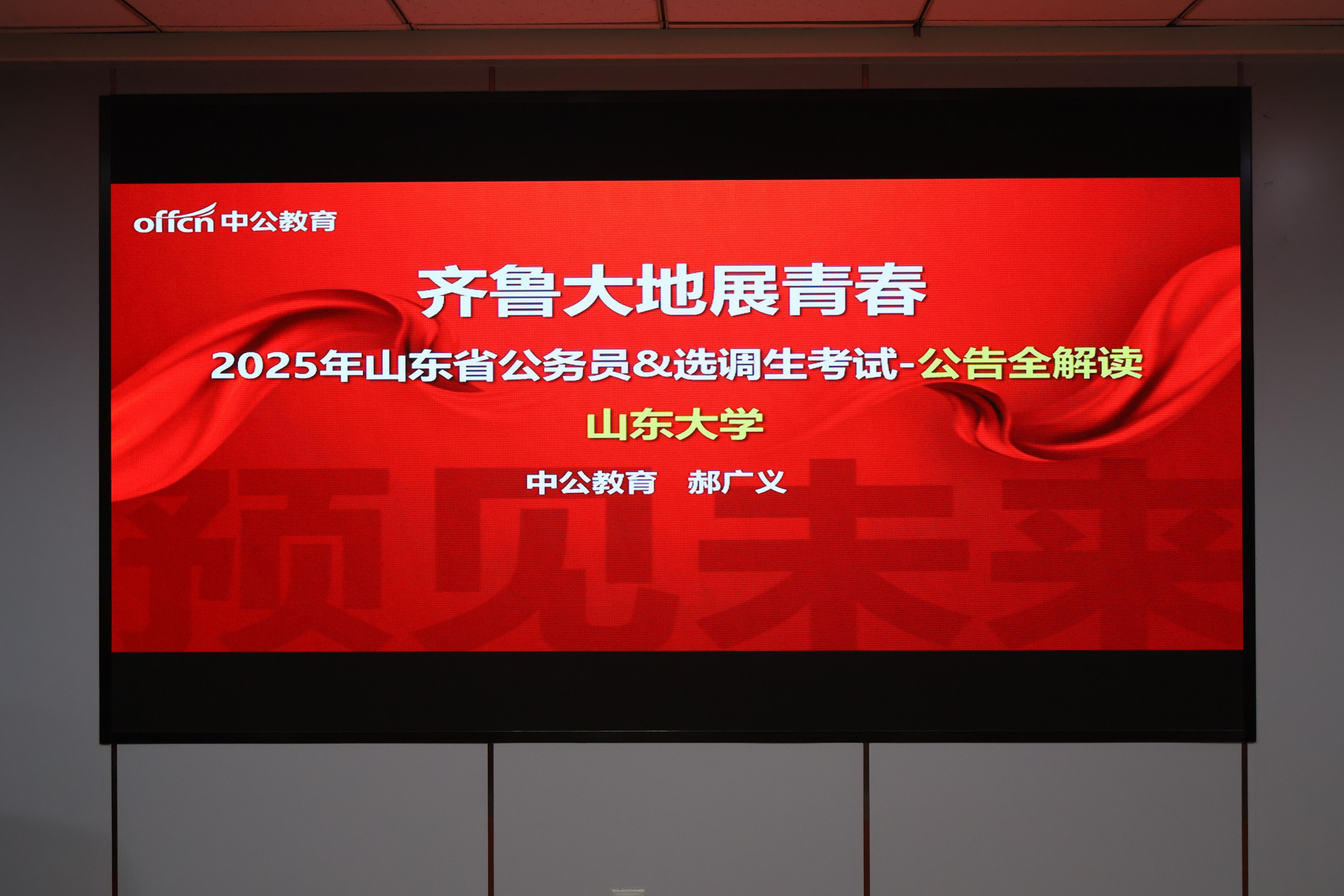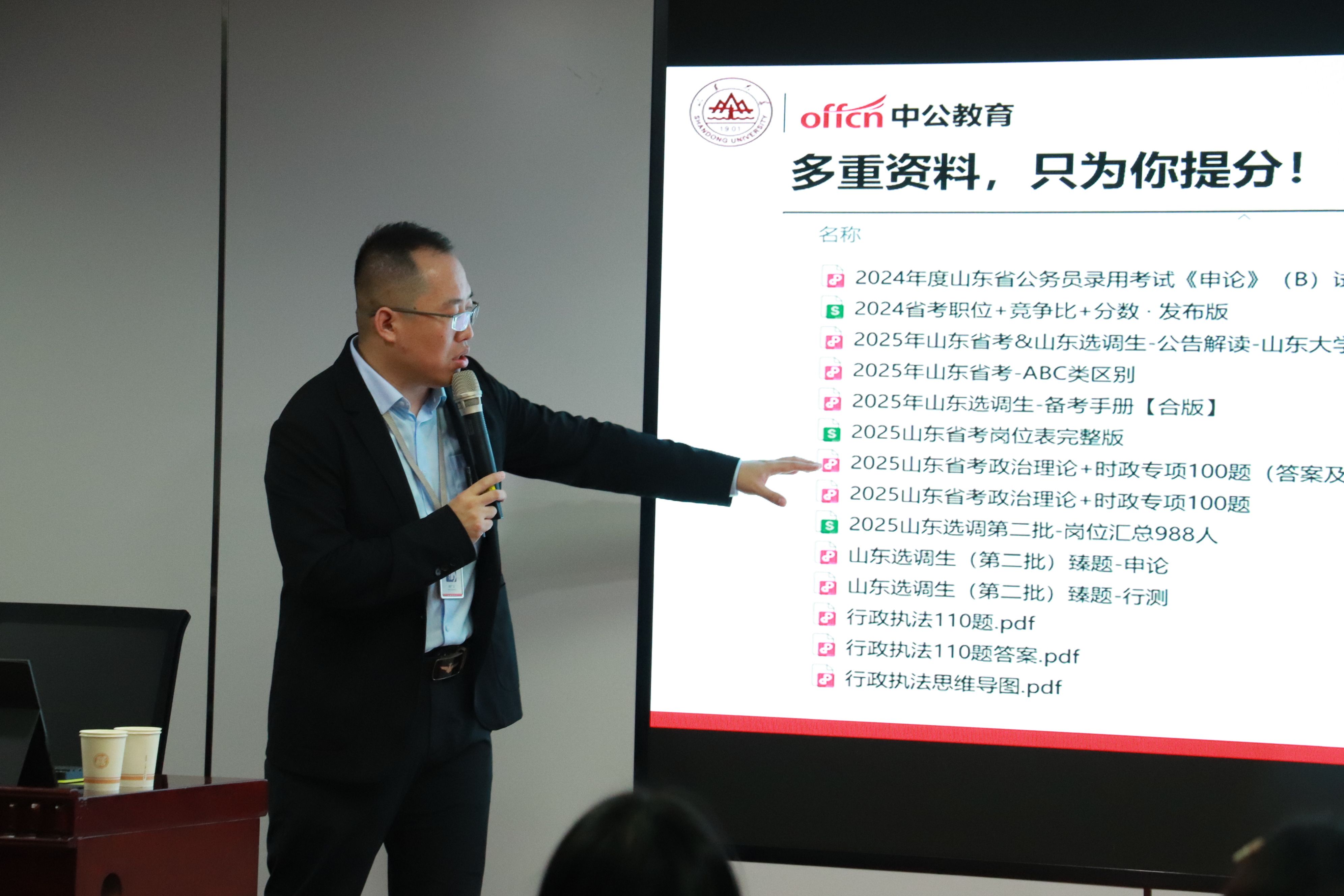 为增进同学们对山东省公务员考试及选调生考试政策的了解,解决同学们备考过程中的疑惑,太阳集团历史学院、tyc86太阳集团于11月13日在中心校区知新楼A1017举办了2025年度山东省公务员考试及选调生考试公告解读会。本次活动邀请中公教育资深讲师郝广义老师作为主讲嘉宾,致力于为同学提供公务员考试的最新动态,帮助同学规划高效的备考复习策略。