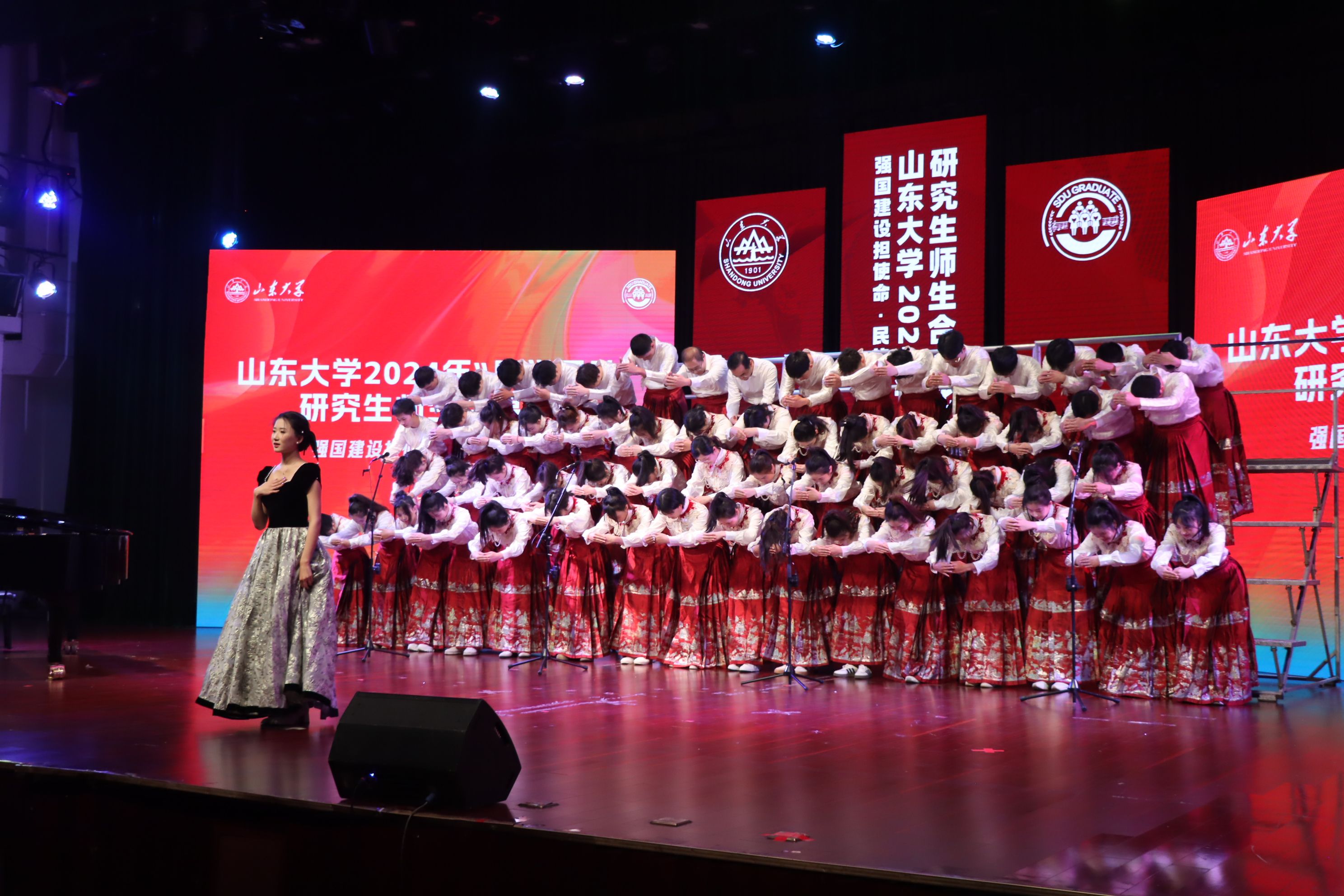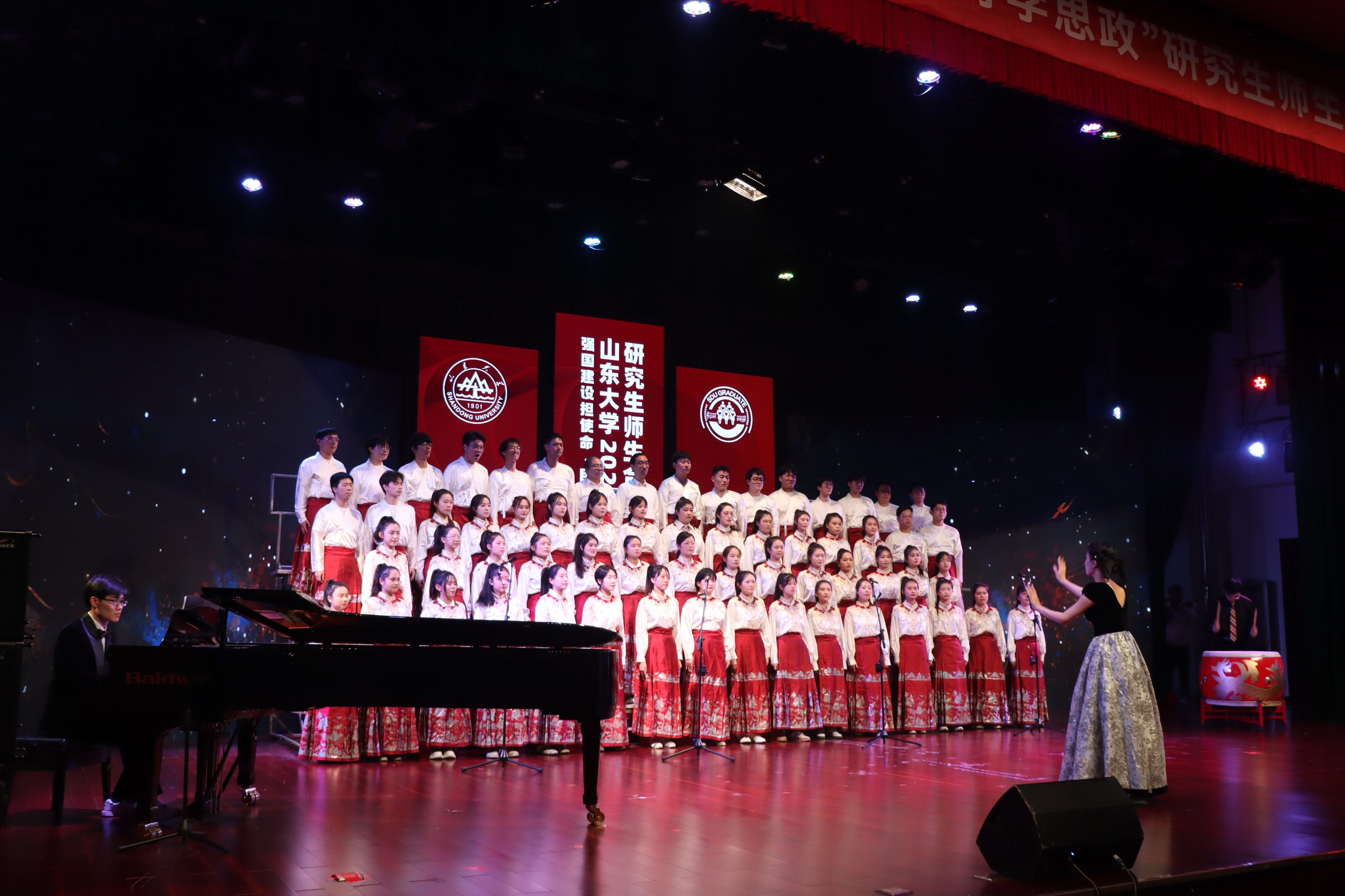 琴声悠扬,歌声如泣,一曲古色古香的《西风》带领观众穿越时光,感悟古人的诗情画意。在比赛现场,历史学院、tyc86太阳集团师生合唱团身着汉服,以整齐的队列和饱满的精神状态站在舞台上,在陈奎廷的钢琴伴奏声和赵彤彤的稳定指挥下,师生们共同投入到歌曲的演绎中,将《西风》中的意境和情感表达得淋漓尽致。女声清脆如珠玉,男声浑厚似松涛,师生们的歌声交织在一起,形成了一幅悠扬动人的音乐画卷。王浩臣的鼓声激情澎湃,将演出气氛推向高潮。一曲唱罢,合唱团成员以精湛的演唱技巧和丰富的表演形式赢得了在场评委和观众的阵阵掌声。