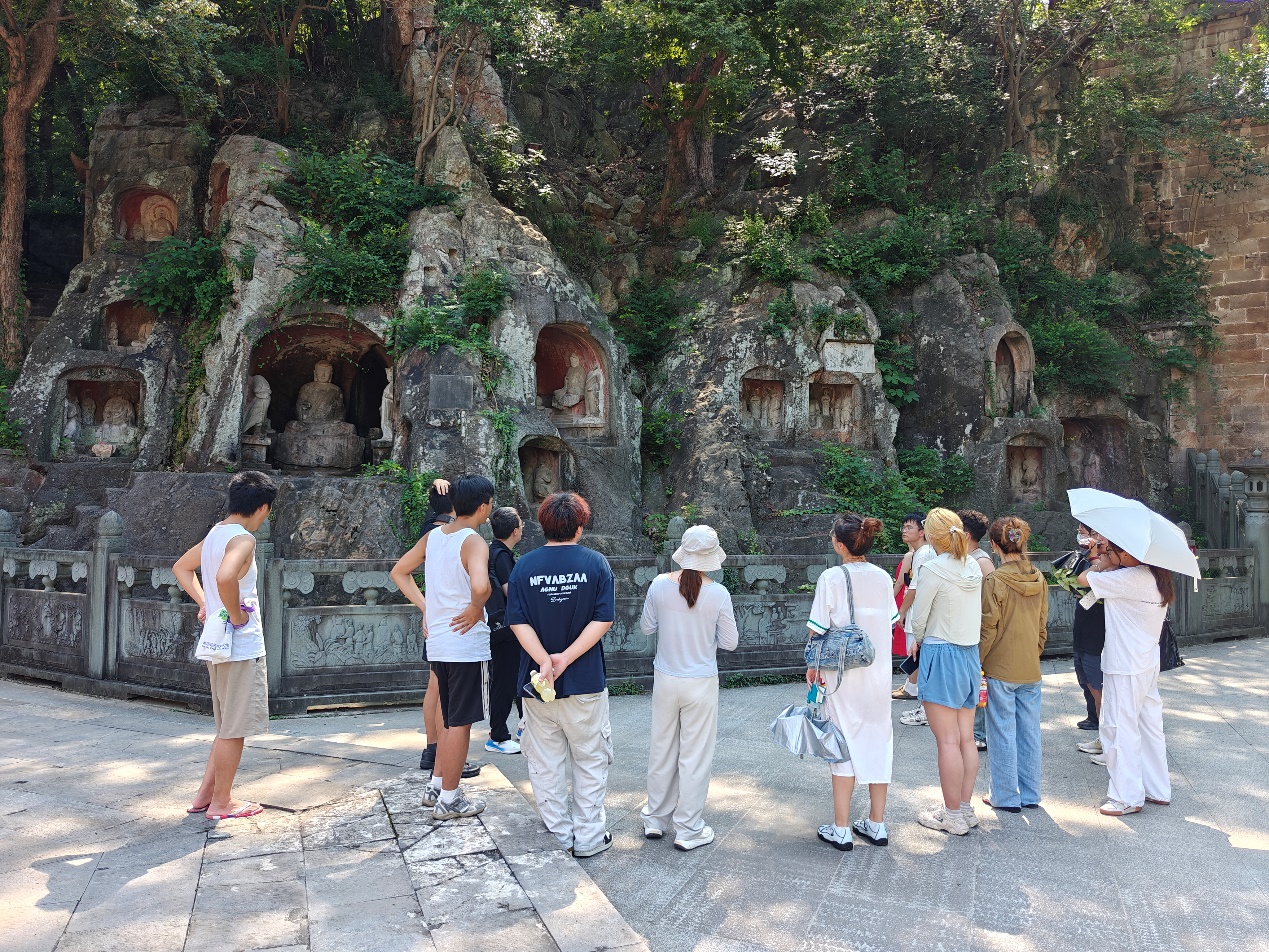 7月4日,在研学活动的最后一天,同学们前往千佛崖石窟为此次研学之旅画上句号。期间,栖霞山石窟研究院陈佩、栖霞山文化休闲旅游度假区管理委员会张军两位老师对石窟寺、舍利塔、寺院等佛教考古遗存进行了详细的讲解。千佛崖石窟是南京地区现存最早的佛教石窟造像群,其造像风格融合了南北文化特色,是研究中国佛教艺术发展的重要实物例证。同学们在石窟前驻足凝望,看着那些在岁月侵蚀下依然依稀可辨的佛像,感受到了佛教文化的悠久历史和强大生命力。