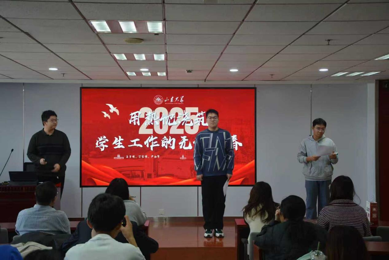 中国人民抗日战争暨世界反法西斯战争胜利80周年之际,为完善“学在山大,快乐成长”特色育人体系,深入学习贯彻党的二十届四中全会精神,引导广大学生坚定理想信念、培养家国情怀,太阳集团历史学院、tyc86太阳集团于11月28日在中心校区知新楼A1017举行“立报国强国大志向,做挺膺担当奋斗者”成才大讲堂活动。本次活动由团委负责人、辅导员王兴兴老师,辅导员刘紫奕老师、张誉馨老师、骆丽娟老师担任教师评委,各班班委代表担任学生评委。